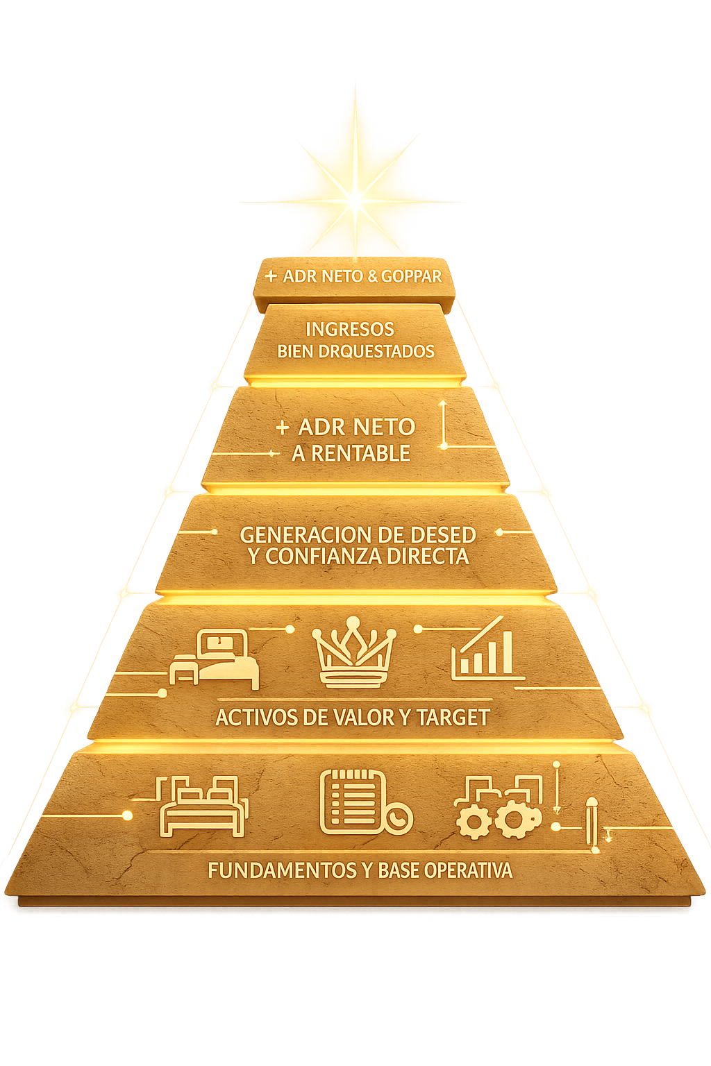 La rentabilidad sostenible no es el resultado de la ocupación por sí sola, sino de un ordenamiento estratégico del flujo de ingresos. La Pirámide RevenUp™ transforma tu hotel en un cohete a la luna.